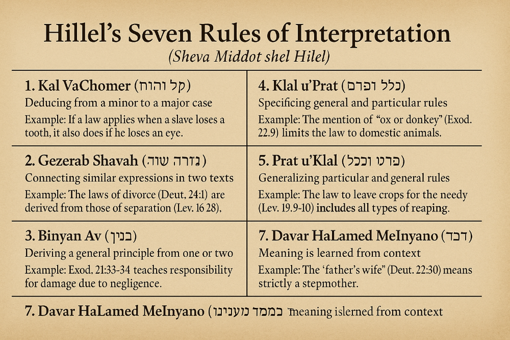 The Seven Rules of Hillel they represent the first attempt encode biblical hermeneutics within the rabbinic judaism. They constitute the point of departure for the 13 rules of Rabbi Ishmael and the 32 of Rabbi Eliezer ben Yose ha-Galili.